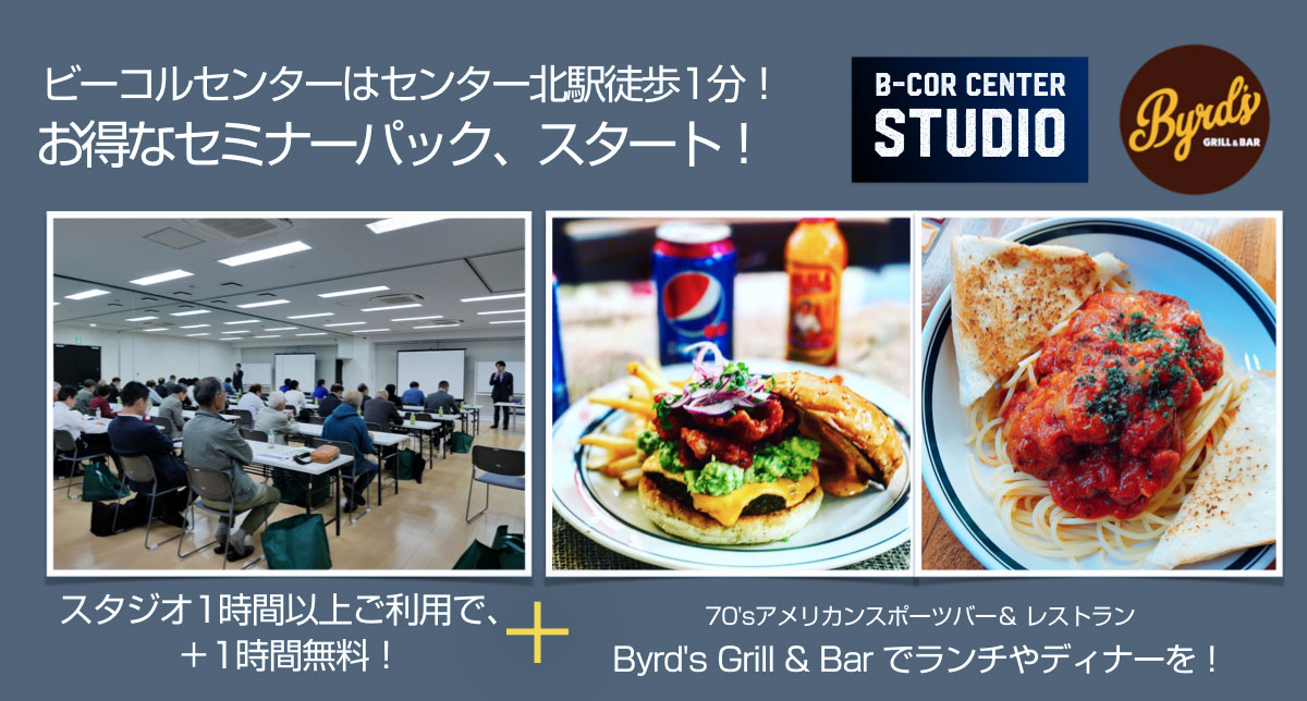 スタジオでセミナー!BYRD’S GRILL & BARで美味しいお料理!会議や研修など2時間のスタジオ利用とランチ・ディナーがセットになったお得なプランです。